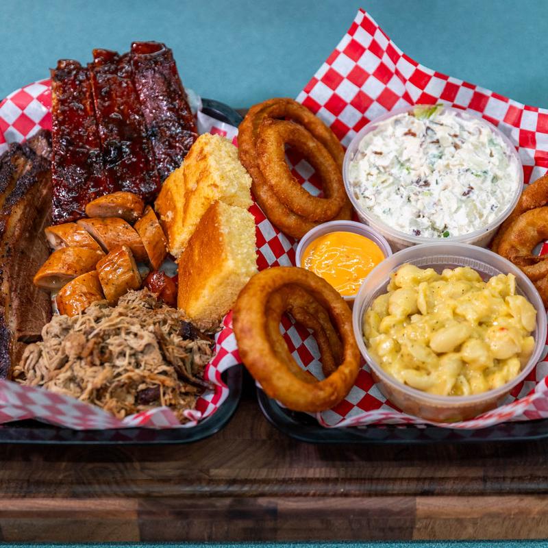 1 lb Brisket + 1 lb Pulled Pork + 1 lb Cheddar Sausage + 1 lb Slice Turkey Breast + 1 Rack of Ribs + Choice of (3) Half Chickens or 15 Smoke Fried Wings + (2) 32 oz Large Sides + 8 Pieces of Cornbread