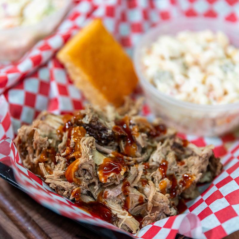 Choose Any 2 Meats: Brisket, Pulled Pork, Ribs, 1/4 Chicken, Cheddar Sausage, or Sliced Turkey, served with 2 Pieces of Cornbread and 3 Sides