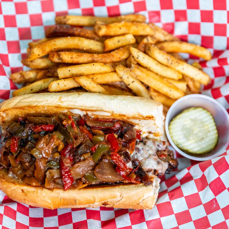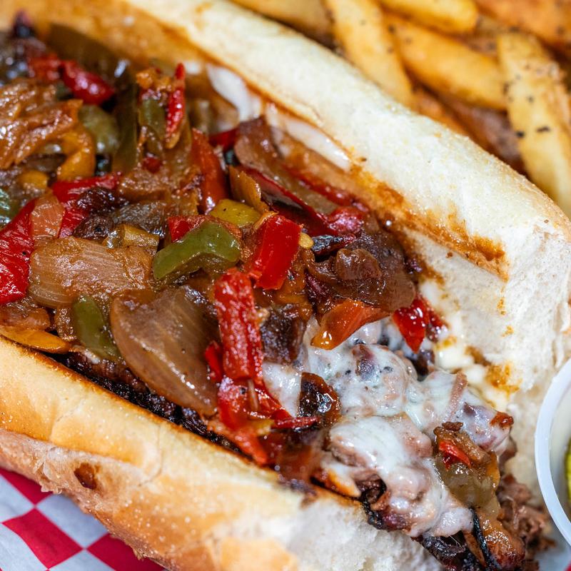 Beef Brisket topped with Sauteed Peppers & Onions, Melted Provolone Cheese on a Toasted Bun with Homemade Garlic Aioli